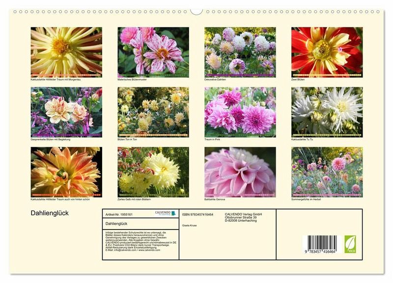 PREMIUM-LINIE - Brillanter Fotokalender mit 12 wunderschönen Motiven, Kunstdruck in Hochglanz in Museumsqualität.QUALITÄT - edle Materialien, stabile Rückwand mit 2 innovativen Einstecktaschen für eine optimale Präsentation an der Wand.NACHHALTIG - deutliche Abfallreduzierung durch bedarfsgerechte Einzelstückfertigung, umweltfreundlichesFSC-zertifiziertes Papier, Produktion in Deutschland, klimabewusste Logistik.PERFEKTES GESCHENK - Kalender für Freunde und Familie, für Kinder und Erwachsene, jung und alt, zu Weihnachten, Geburtstag oder zwischendurch.Dahlien erzeugen Glücksgefühle von Autor(in): Gisela Kruse