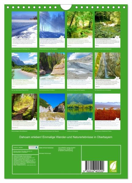 QUALITÄT - Hochwertiger Fotokalender mit 12 wunderschönen Motiven auf lichtbeständigem Bilderdruckpapier, robuste Spiralbindung mit Aufhängebügel.NACHHALTIG - deutliche Abfallreduzierung durch bedarfsgerechte Einzelstückfertigung, umweltfreundliches FSC-zertifiziertes Papier, Produktion in Deutschland, klimabewusste Logistik.PERFEKTES GESCHENK - Kalender für Freunde und Familie, für Kinder und Erwachsene, jung und alt, zu Weihnachten, Geburtstag oder zwischendurch.VIELFALT - Bildkalender in verschiedenen Formaten, z.B. DIN A5, DIN A4, DIN A3 sowie DIN A2. Ob Naturmotiv, Gemälde oder Fotos, ideal für ein persönliches Wohlfühlambiente.Tipps für familienfreundliche Natur-und Wandererlebnisse in Oberbayern von Autor(in): Michaela Spreider