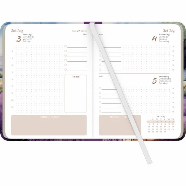 Ansprechendes Design: Fester Einband im modernen Aquarell-Look handlich und langlebigUmfassende Organisation: 352 Seiten mit Tagesübersicht, Monats- & Jahresübersichten, Habit Tracker und To-Do-ListenÜbersichtliche Planung: 1 Tag pro Seite (Sa/So kombiniert) mit Zeiteinteilung von 06 22 Uhr bzw. 08 18 UhrInternational nutzbar: 4-sprachiges Kalendarium (DE/FR/IT/GB) mit Feiertagen für DE/AT/CH/GB/FR/IT/NL/LUHandliches Format: A6 (ca. 11×15 cm) ideal für Handtasche, Reisen und den mobilen Einsatz