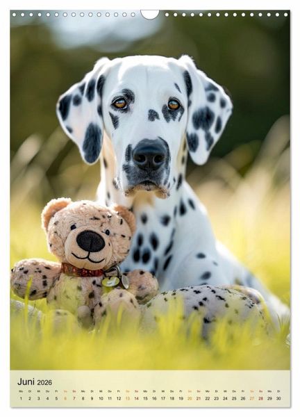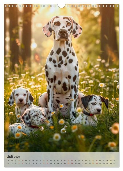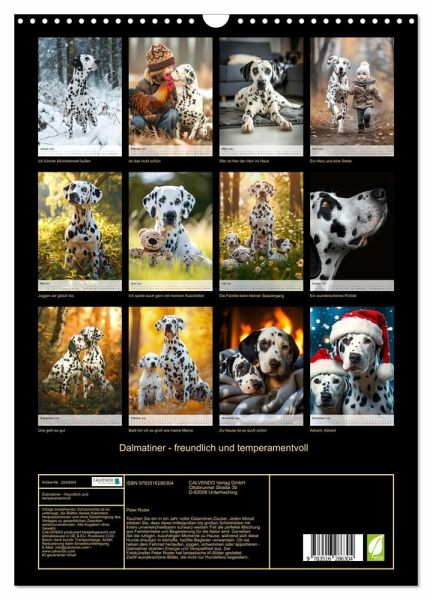 Tauchen Sie ein in ein Jahr voller Dalamtiner-Zauber. Jeden Monat erleben Sie, dass diese mittelgroßen bis großen Schönheiten mit ihrem unverwechselbaren schwarz-weißen Fell die perfekte Mischung aus Familienliebe und Begeisterung für die Natur sind. Genießen Sie die ruhigen, kuscheligen Momente zu Hause, während sich diese Hunde draußen in lebhafte, topfitte Begleiter verwandeln. Ob sie neben dem Fahrrad herlaufen, joggen, schwimmen oder apportieren - Dalmatiner strahlen Energie und Verspieltheit aus. Der Fotokünstler Peter Roder hat fantastische KI-Bilder gestaltet. Zwölf wunderschöne Bilder, die nicht nur Hundefans begeistern.