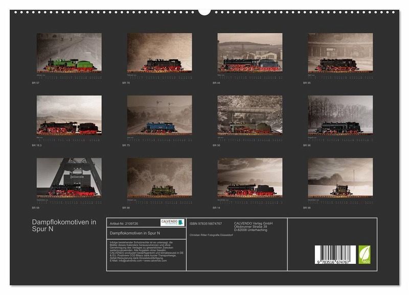 Dampflokomotiven in Spur N zeigt dreizehn ausgewählte Dampflokmodelle vor Landschaftsmotiven ihrer "Lebensräume". Die Modelle sind so fotografiert wie sie auf der Modelbahn fahren, nicht immer ganz perfekt von der Beschriftung aber lebendig und beeindruckend genug, dass man sich das Vorbild leibhaftig vorstellen kann. Dieser Kalender ist eine Homage an die Rösser aus Stahl, bei denen man ihre Kraft sehen und hören kann.