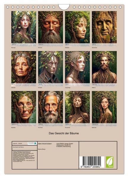 In Mythen und Legenden werden Bäume oft als Individuen dargestellt. Diese Annahme ist Programm unseres Bildkalenders, der zwölf Bilder zeigt, die auf surrealistische Art Gesichter mit Bäumen verbinden. Die Bilder sind mit Hilfe von künstlicher Intelligenz entstanden und haben einen mystischen Anstrich, der sie zu einem besonderen Kunstwerk machen. Dieser Kalender ist nicht nur ein praktisches Hilfsmittel, sondern auch ein Kunstobjekt, das Sie das ganze Jahr über erfreuen wird. Die Bilder sind so detailreich und ausdrucksstark, dass sie Sie zum Träumen einladen und Ihnen helfen, den Alltag zu…mehr