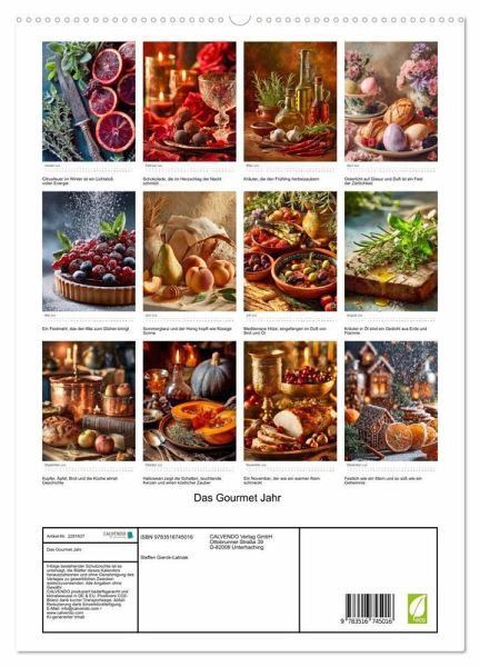 PREMIUM-LINIE - Brillanter Fotokalender mit 12 wunderschönen Motiven, Kunstdruck in Hochglanz in Museumsqualität.QUALITÄT - edle Materialien, stabile Rückwand mit 2 innovativen Einstecktaschen für eine optimale Präsentation an der Wand.NACHHALTIG - deutliche Abfallreduzierung durch bedarfsgerechte Einzelstückfertigung, umweltfreundliches FSC-zertifiziertes Papier, Produktion in Deutschland, klimabewusste Logistik.PERFEKTES GESCHENK - Kalender für Freunde und Familie, für Kinder und Erwachsene, jung und alt, zu Weihnachten, Geburtstag oder zwischendurch.Ein Kalender, der Geschmack in Kunst verwandelt: von Winterzitrus bis Sommerbeeren, von Ostergebäck bis Weihnachtszauber. von Autor(in): Steffen Gierok-Latniak
