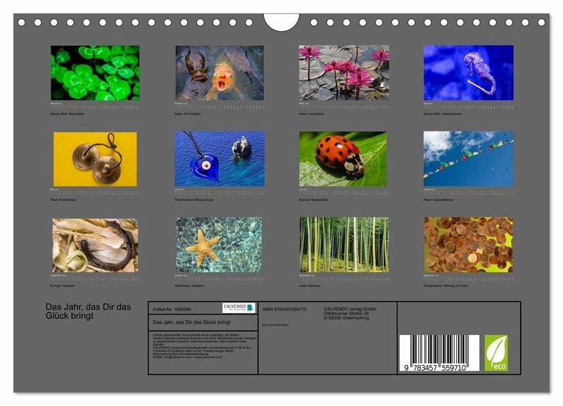 QUALITÄT - Hochwertiger Fotokalender mit 12 wunderschönen Motiven auf lichtbeständigem Bilderdruckpapier, robuste Spiralbindung mit Aufhängebügel.NACHHALTIG - deutliche Abfallreduzierung durch bedarfsgerechte Einzelstückfertigung, umweltfreundliches FSC-zertifiziertes Papier, Produktion in Deutschland, klimabewusste Logistik.PERFEKTES GESCHENK - Kalender für Freunde und Familie, für Kinder und Erwachsene, jung und alt, zu Weihnachten, Geburtstag oder zwischendurch.VIELFALT - Bildkalender in verschiedenen Formaten, z.B. DIN A5, DIN A4, DIN A3 sowie DIN A2. Ob Naturmotiv, Gemälde oder Fotos, ideal für ein persönliches Wohlfühlambiente.Bilder von internationalen Glücksbringer von Autor(in): LivePics by Lena Iliopoulou