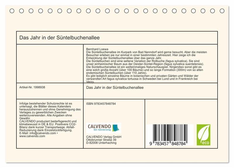 QUALITÄT - Hochwertiger Fotokalender mit 12 wunderschönen Motiven auf lichtbeständigem Bilderdruckpapier, robuste Spiralbindung.NACHHALTIG - deutliche Abfallreduzierung durch bedarfsgerechte Einzelstückfertigung, umweltfreundliches FSC-zertifiziertes Papier, Produktion in Deutschland, klimabewusste Logistik.PERFEKTES GESCHENK - Kalender für Freunde und Familie, für Kinder und Erwachsene, jung und alt, zu Weihnachten, Geburtstag oder zwischendurch.VIELFALT - Bildkalender in verschiedenen Formaten, z.B. DIN A5, DIN A4, DIN A3 sowie DIN A2. Ob Naturmotiv, Gemälde oder Fotos, ideal für ein persönliches Wohlfühlambiente.Fotos von der jahreszeitlichen Entwicklung in der Süntelbuchenallee von Bad Nenndorf von Autor(in): Bernhard Loewa