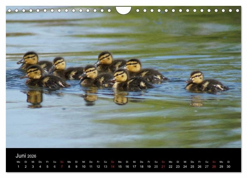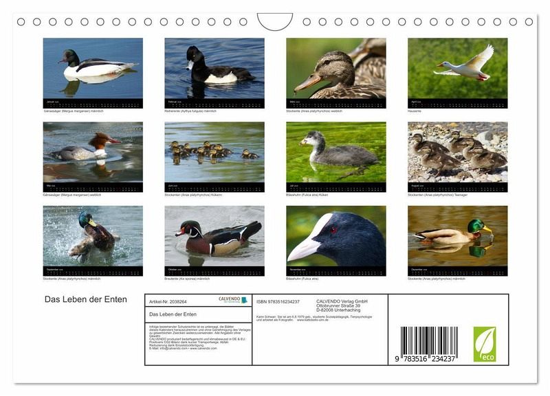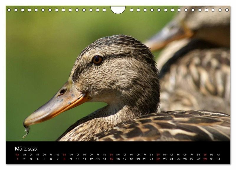 Die Familie der Enten ist wohl jedem bekannt. Das sie aber sehr viele Arten enthält, ist den meisten weniger geläufig. Der Kalender präsentiert neben den bekannten Stockenten und Blesshühnern auch noch seltenere Arten, wie die Reiherente, den Gänsesäger sowie die Brautente. Nicht nur als Comic Donald Duck ist die Familie der Enten bei groß und klein beliebt.