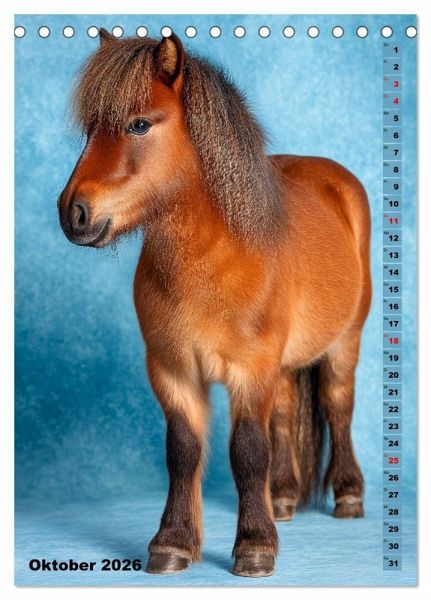 Oktober: Braunes Zwergpony vor blauem Hintergrund