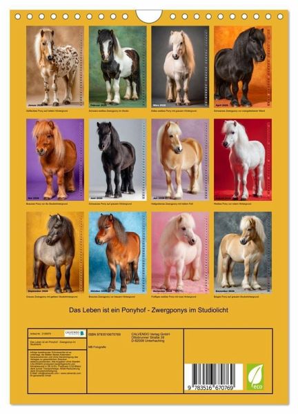 Abbildungen: Januar: Geflecktes Pony auf hellem Hintergrund Februar: Schwarz-weißes Zwergpony im Studio März: Edles weißes Pony mit grauem Hintergrund April: Schwarzes Zwergpony vor orangefarbener Wand Mai: Braunes Pony vor lila Studiohintergrund Juni: Schwarzes Pony auf grauem