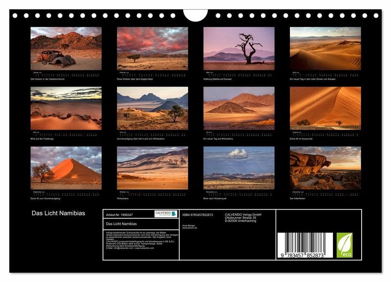 QUALITÄT - Hochwertiger Fotokalender mit 12 wunderschönen Motiven auf lichtbeständigem Bilderdruckpapier, robuste Spiralbindung mit Aufhängebügel.NACHHALTIG - deutliche Abfallreduzierung durch bedarfsgerechte Einzelstückfertigung, umweltfreundliches FSC-zertifiziertes Papier, Produktion in Deutschland, klimabewusste Logistik.PERFEKTES GESCHENK - Kalender für Freunde und Familie, für Kinder und Erwachsene, jung und alt, zu Weihnachten, Geburtstag oder zwischendurch.VIELFALT - Bildkalender in verschiedenen Formaten, z.B. DIN A5, DIN A4, DIN A3 sowie DIN A2. Ob Naturmotiv, Gemälde oder Fotos, ideal für ein persönliches Wohlfühlambiente.Namibias Landschaften im besonderen Licht von Autor(in): Anne Berger