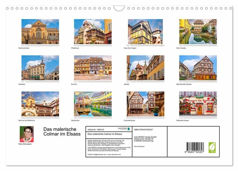 Dieser herausragende Kalender zeigt jeden Monat wunderschöne Motive von der bekanntesten Stadt im Elsass - Colmar. Das Altstadtbild wird geprägt von den typisch elsässischen Fachwerkhäusern aus dem Mittelalter, Klein-Venedig mit den Steinbrücken, der römisch-katholischen Stiftskirche und einem Schmuckstück der Renaissance - das Pfisterhaus und lädt zu einem Bummel ein. Lassen Sie sich inspirieren und gehen Sie mit auf eine Entdeckungsreise.