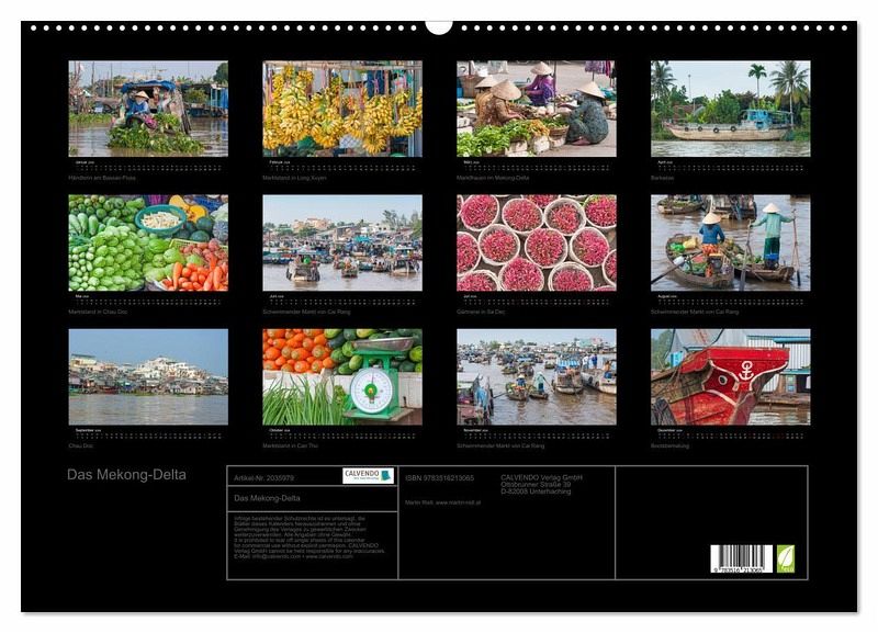 Das Mekong-Delta im Süden Vietnams ist eine der fruchtbarsten Regionen der Erde und kann zu recht als "Garten der Welt" bezeichnet werden. Die zahlreichen schwimmenden Märkte, die üppige Vegetation, die Vielfalt der landwirtschaftlichen Produkte sowie die freundlichen Einwohner des Mekong-Deltas machen dieses Wasserlabyrinth zu einem faszinierenden Ort. Mit diesem Kalender erleben Sie eine Fotoreise durch ein tropisches Paradies.