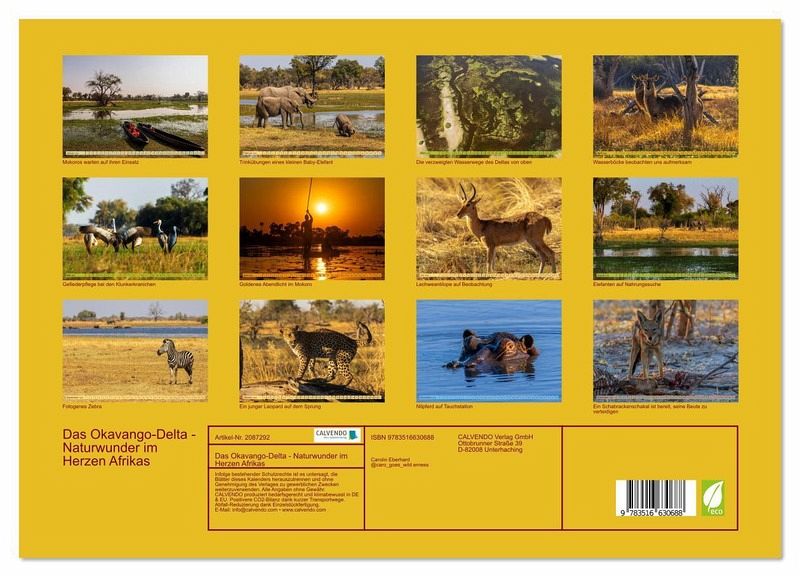 Erleben Sie die atemberaubende Schönheit des Okavangodeltas in zwölf faszinierenden Monatsmotiven. Jeder Kalender zeigt die einzigartige Tierwelt, magische Wasserlandschaften und unberührte Natur dieses UNESCO-Welterbes. Lassen Sie sich Monat für Monat in eine der letzten großen Wildnisregionen Afrikas entführen. Ideal für Naturfreunde, Reiselustige und alle, die sich nach Abenteuer sehnen.