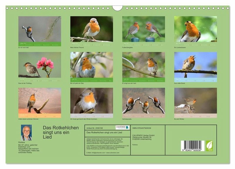 QUALITÄT - Hochwertiger Fotokalender mit 12 wunderschönen Motiven auf lichtbeständigem Bilderdruckpapier, robuste Spiralbindung mit Aufhängebügel.NACHHALTIG - deutliche Abfallreduzierung durch bedarfsgerechte Einzelstückfertigung, umweltfreundliches FSC-zertifiziertes Papier, Produktion in Deutschland, klimabewusste Logistik.PERFEKTES GESCHENK - Kalender für Freunde und Familie, für Kinder und Erwachsene, jung und alt, zu Weihnachten, Geburtstag oder zwischendurch.VIELFALT - Bildkalender in verschiedenen Formaten, z.B. DIN A5, DIN A4, DIN A3 sowie DIN A2. Ob Naturmotiv, Gemälde oder Fotos, ideal für ein persönliches Wohlfühlambiente.Das Rotkehlchen strahlt eine besondere Ruhe aus. Es ist oft bei uns im Garten zu Gast. von Autor(in): Rufotos