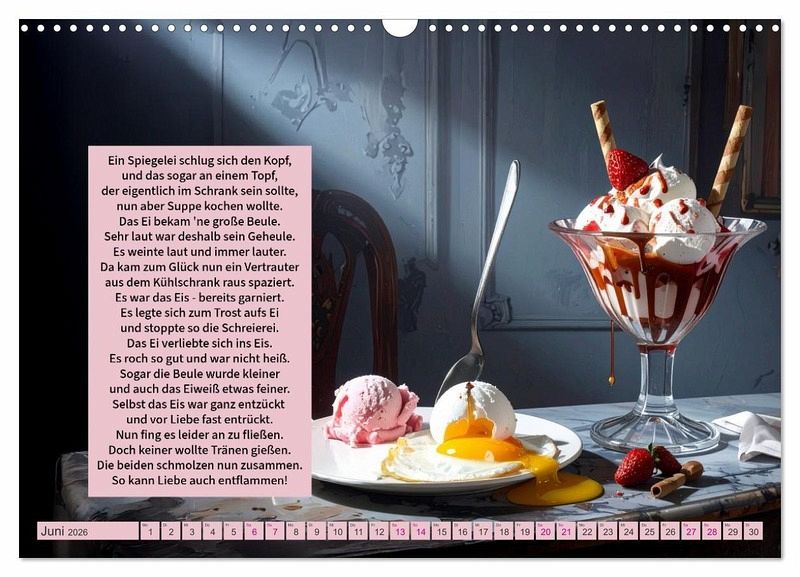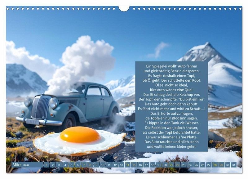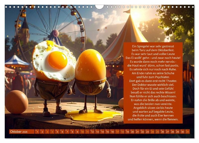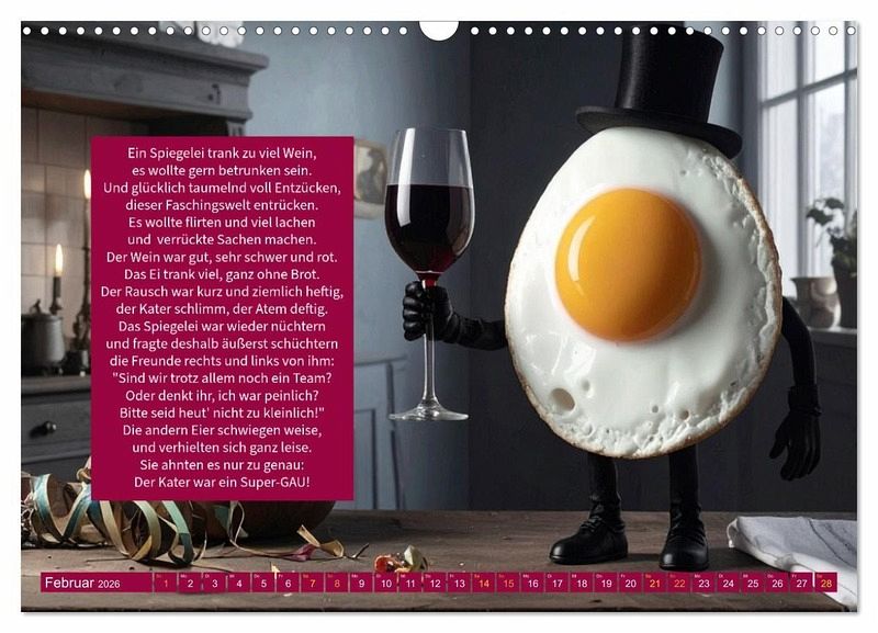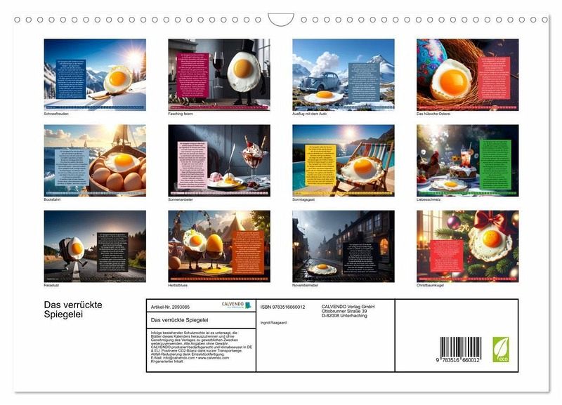 Jeden Monat begleitet der Betrachter das "verrückte Spiegelei" auf einer neuen, humorvollen Reise. Mal findet es sich im Schneesturm wieder, mal am Swimmingpool, mal auf hoher See oder mitten im herbstlichen Nebel. Jede Szene wurde mit moderner KI-Technik gestaltet, die Texte stammen dagegen alle aus der Feder von Ingrid Raagaard - mal augenzwinkernd, mal leicht schräg, aber immer charmant.