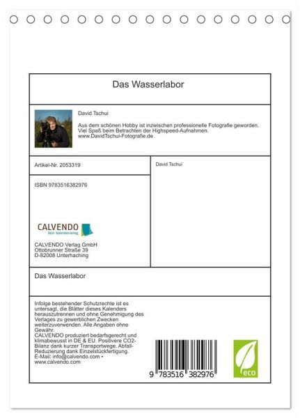 QUALITÄT - Hochwertiger Fotokalender mit 12 wunderschönen Motiven auf lichtbeständigem Bilderdruckpapier, robuste Spiralbindung.NACHHALTIG - deutliche Abfallreduzierung durch bedarfsgerechte Einzelstückfertigung, umweltfreundliches FSC-zertifiziertes Papier, Produktion in Deutschland, klimabewusste Logistik.PERFEKTES GESCHENK - Kalender für Freunde und Familie, für Kinder und Erwachsene, jung und alt, zu Weihnachten, Geburtstag oder zwischendurch.VIELFALT - Bildkalender in verschiedenen Formaten, z.B. DIN A5, DIN A4, DIN A3 sowie DIN A2. Ob Naturmotiv, Gemälde oder Fotos, ideal für ein persönliches Wohlfühlambiente.Sie sehen hier 12 großfomartige Hochgeschwindigkeitsaufnahmen. Aufgenommen im Jahr 2018 zeigen die Fotos Tropfen und Wassermischungen mit Laborgläsern auf Glasplatten und einem eigens angefertigten kleinen Pool. von Autor(in): David Tschui