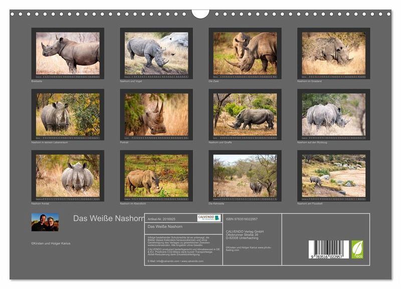 Es gibt sie noch, die Weißen Nashörner, allerdings sind sie immer mehr vom Aussterben bedroht. Die Fotografen Kirsten und Holger Karius, haben diese vom Aussterben bedrohte Art, im größten Nationalpark Südafrikas aufgespürt und aus ihren dort entstandenen Aufnahmen einen Kalender für sie zusammen gestellt.