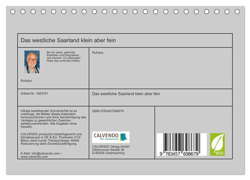 QUALITÄT - Hochwertiger Fotokalender mit 12 wunderschönen Motiven auf lichtbeständigem Bilderdruckpapier, robuste Spiralbindung.NACHHALTIG - deutliche Abfallreduzierung durch bedarfsgerechte Einzelstückfertigung, umweltfreundliches FSC-zertifiziertes Papier, Produktion in Deutschland, klimabewusste Logistik.PERFEKTES GESCHENK - Kalender für Freunde und Familie, für Kinder und Erwachsene, jung und alt, zu Weihnachten, Geburtstag oder zwischendurch.VIELFALT - Bildkalender in verschiedenen Formaten, z.B. DIN A5, DIN A4, DIN A3 sowie DIN A2. Ob Naturmotiv, Gemälde oder Fotos, ideal für ein persönliches Wohlfühlambiente.Das Saarland ist sehenswert und bietet eine wunderbare Natur. Die Nähe zu Frankreich und Luxenburg macht das Saarland unvergesslich. von Autor(in): Rufotos