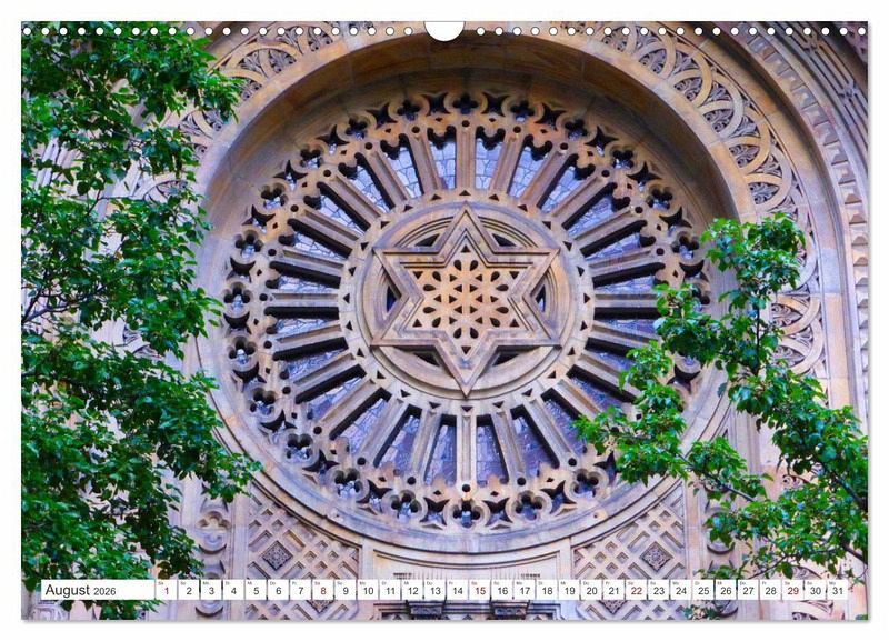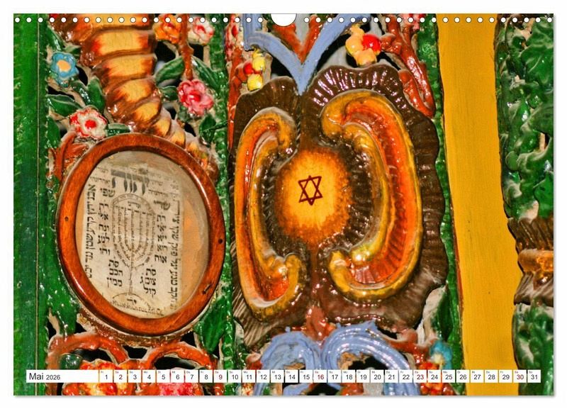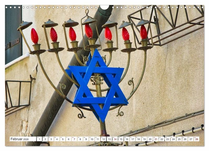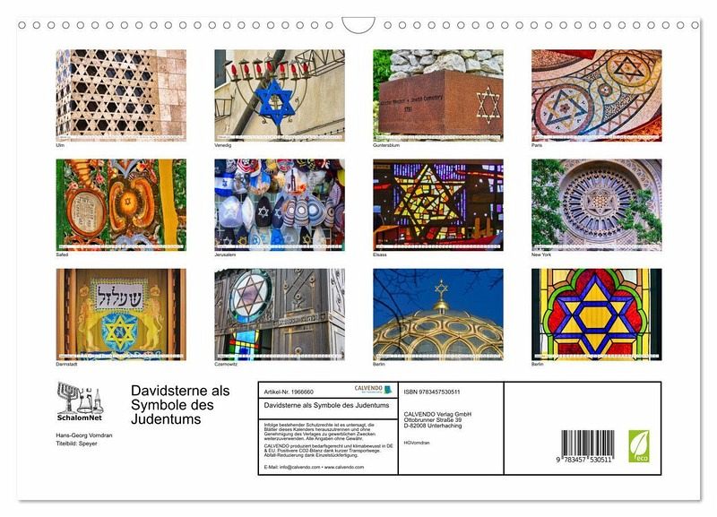 Der Davidstern heißt auf Hebräisch Magen David, Davidschild. Schon in der Antike war er verbreitet. Als Symbol des Judentums findet er seit dem 19. Jahrhundert weite Verbreitung. Unsere Kalenderblätter zeigen moderne, historische und gegenwärtige Beispiele in Deutschland, Europa, Israel und der USA.