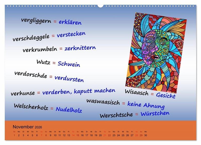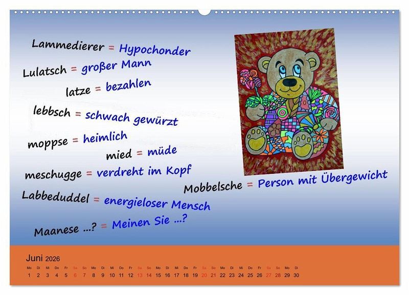Deutsch - Hessisch? Hessisch - Deutsch? Ihr seid in Hessen und versteht kein Wort? Dann ist dieser Kalender genau das Richtige. Er zeigt Euch auf einfache Weise hessische Vokabeln und Begriffe, umrahmt von meinen lustigen Gemälden, und erklärt Monat für Monat, was diese bedeuten. Beim nächsten Besuch in Hessen versteht Ihr bestimmt vieles mehr und könnt sogar mitbabbele.