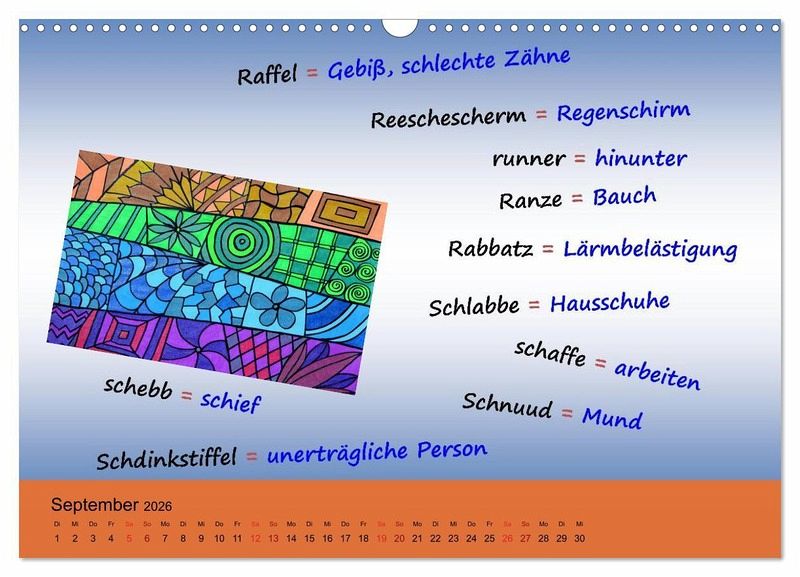 Deutsch - Hessisch? Hessisch - Deutsch? Ihr seid in Hessen und versteht kein Wort? Dann ist dieser Kalender genau das Richtige. Er zeigt Euch auf einfache Weise hessische Vokabeln und Begriffe, umrahmt von meinen lustigen Gemälden, und erklärt Monat für Monat, was diese bedeuten. Beim nächsten Besuch in Hessen versteht Ihr bestimmt vieles mehr und könnt sogar mitbabbele.