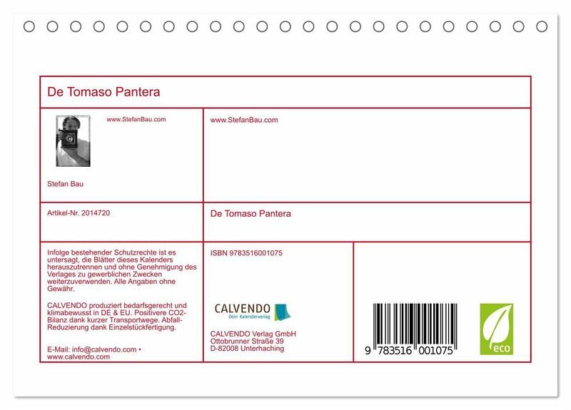 Der bekannte Fotograf Stefan Bau präsentiert in diesem opulenten Kalender fantastische Bilder des seltenen De Tomaso Pantera. Präzise Detailaufnahmen aus dem professionellen Studio ergänzen die wundervollen Bilder. Ein Kalender, der zum Träumen einlädt. Das ideale Geschenk für Auto- und Sportwagenfans!