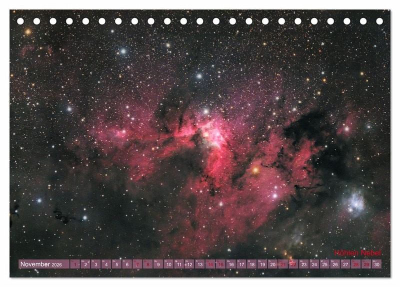 Entdecken Sie die unendliche Schönheit und Vielfalt unserer Milchstraße, Monat für Monat. Unser exklusiver Deep Sky Kalender enthüllt jeden Monat ein faszinierendes, einzigartiges Bild aus unserer Milchstraße. Jedes Blatt bringt Ihnen die Wunder des Kosmos in Ihr Zuhause. Die Aufnahmen wurden in hoher Auflösung, sowohl in Farbe als auch mit Schmalband-Filtern aufgenommen. So erhalten Sie exclusive Eindrücke, wie sie auch das Hubble Weltraumteslekop aufgenommen hat.