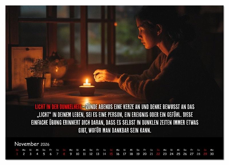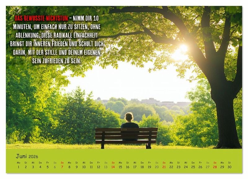 Achtsamkeit und Anti-Stress im Alltag - dieser Achtsamkeitskalender für Erwachsene schenkt dir jeden Monat eine wohltuende Übung für mehr innere Ruhe, Lebensfreude und Körperwahrnehmung. Ideal zur Burnout-Prävention und für ein bewussteres Leben: Die Achtsamkeitsübungen helfen dir, dein Selbstbewusstsein zu stärken und mehr Balance zu finden - ob zu Hause, als Kalender fürs Büro oder als Geschenk für Kollegen. Ob als Achtsamkeit-Geschenk, Nervennahrung-Geschenk für Kollegen oder Meditationskalender für dich selbst - dieser Lebensfreude-Kalender inspiriert mit einfachen Übungen und Momenten der Entspannung. Verschenke bewusste Pausen, Glück und Ruhe: an deine beste Freundin, Partnerin oder dich selbst. Ein Werk, welches mit KI-gestalteten Motiven und positiven Impulsen das Jahr begleitet.