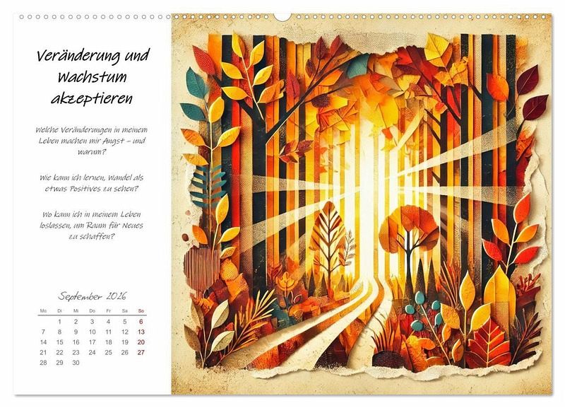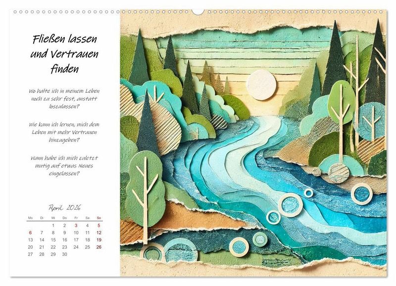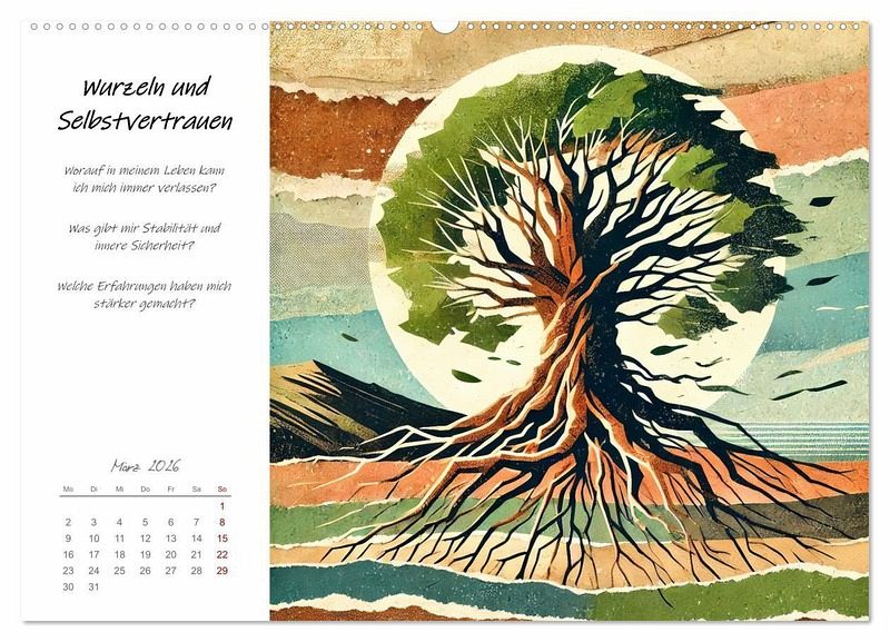 Jede Monatsseite zeigt ein einzigartiges Naturmotiv im kreativen Collagen-Stil. Dazu gibt es Reflexionsfragen, Impulse die dir helfen, dein Selbstbewusstsein zu stärken und deinen persönlichen Wachstumspfad zu entdecken.
