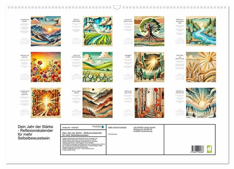QUALITÄT - Hochwertiger Fotokalender mit 12 wunderschönen Motiven auf lichtbeständigem Bilderdruckpapier, robuste Spiralbindung mit Aufhängebügel.NACHHALTIG - deutliche Abfallreduzierung durch bedarfsgerechte Einzelstückfertigung, umweltfreundliches FSC-zertifiziertes Papier, Produktion in Deutschland, klimabewusste Logistik.PERFEKTES GESCHENK - Kalender für Freunde und Familie, für Kinder und Erwachsene, jung und alt, zu Weihnachten, Geburtstag oder zwischendurch.VIELFALT - Bildkalender in verschiedenen Formaten, z.B. DIN A5, DIN A4, DIN A3 sowie DIN A2. Ob Naturmotiv, Gemälde oder Fotos, ideal für ein persönliches Wohlfühlambiente.In 12 Monate zu mehr Selbstbewusstsein - Dein Reflexionskalender mit KI-generierten Natur-Collagen. von Autor(in): Michaela Spreider