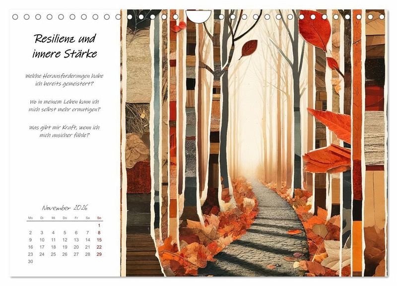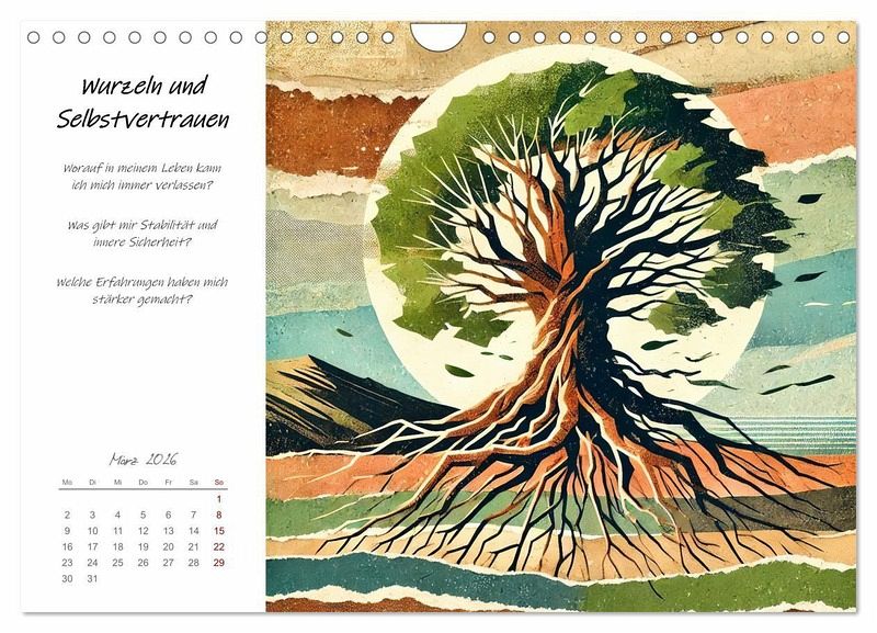 Jede Monatsseite zeigt ein einzigartiges Naturmotiv im kreativen Collagen-Stil. Dazu gibt es Reflexionsfragen, Impulse die dir helfen, dein Selbstbewusstsein zu stärken und deinen persönlichen Wachstumspfad zu entdecken.
