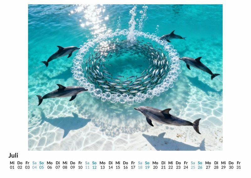 Die Ozeane bergen Geschöpfe von bemerkenswerter Intelligenz und ansteckender Lebensfreude. Delfine faszinieren die Menschheit seit jeher mit ihrem sozialen Verhalten und ihrer verspielten Natur. Der Kalender "Delfin" fängt diese besonderen Eigenschaften in zwölf Monatsmotiven ein und begleitet durch ein Jahr voller Energie und Gemeinschaftssinn. Dieser Kalender ist eine ideale Wahl: Für Liebhaber der Meereswelt und ihrer Bewohner. Für Menschen, die von der Klugheit und dem Gemeinschaftssinn der Delfine beeindruckt sind. Für alle, die einen Wandkalender suchen, der mehr als nur Tage anzeigt, sondern Geschichten erzählt. Jeder Monat präsentiert eine andere Facette dieser Meeressäuger. Die Motive zeigen die Tiere in dynamischen Sprüngen, bei der gemeinsamen Jagd oder in ruhigen Momenten unter der Wasseroberfläche. Jedes Bild wurde durch die Interpretation von unzähligen Daten und Beschreibungen zu einer einzigartigen visuellen Komposition geformt. So entsteht eine Sammlung, die die Essenz des Delfins, seine Intelligenz, sein soziales Wesen und seine Verspieltheit, auf neue Weise darstellt. Der Kalender bietet: Zwölf Monatsblätter mit Motiven von Delfinen. Ein praktisches Kalendarium für die Organisation des Alltags. Eine ganzjährige Begleitung durch die Welt dieser faszinierenden Meerestiere. Der Kalender "Delfin" ist mehr als eine Sammlung von Bildern; er ist eine tägliche Erinnerung an die Schönheit und Komplexität des Lebens im Ozean. Die Motive laden dazu ein, die Welt der Delfine Monat für Monat neu zu entdecken. Eine Vorschau aller Kalenderblätter gibt einen vollständigen Einblick in die Zusammenstellung.