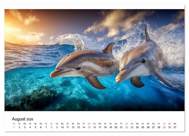 Entdecken Sie eine Welt voller Anmut, Freiheit und Lebensfreude mit atemberaubenden KI-generierten Bildern. Ob elegant aus den Wellen springend, pfeilschnell durchs Wasser gleitend oder sanft in der Tiefe schwebend - Delfine verzaubern mit ihrer Energie, ihrer Verspieltheit und ihrem natürlichen Charme. Mal allein, mal in vertrauter Zweisamkeit oder lebendig in Gruppen - dieser Kalender fängt die ganze Vielfalt ihres Lebensraums und ihres Wesens ein und erinnert daran, wie wertvoll und schützenswert unsere Ozeane sind. Ein perfektes Geschenk für alle, die das Meer lieben - und Delfine noch mehr.