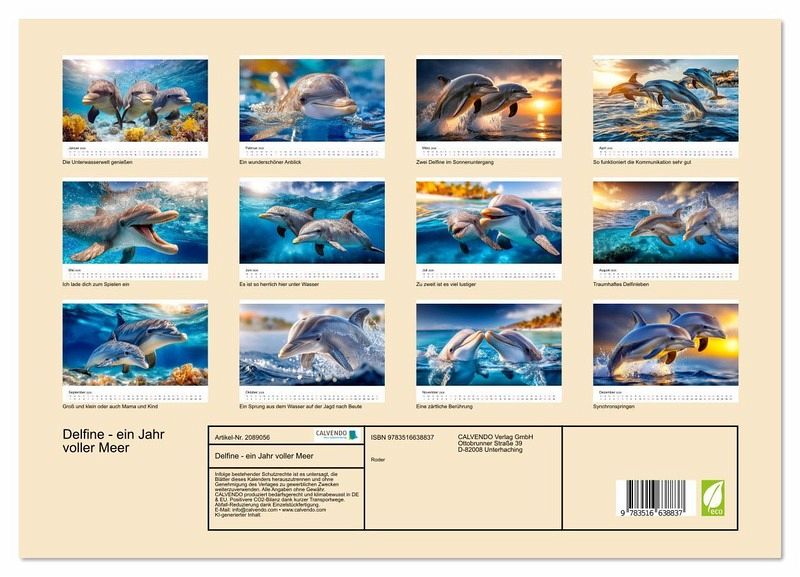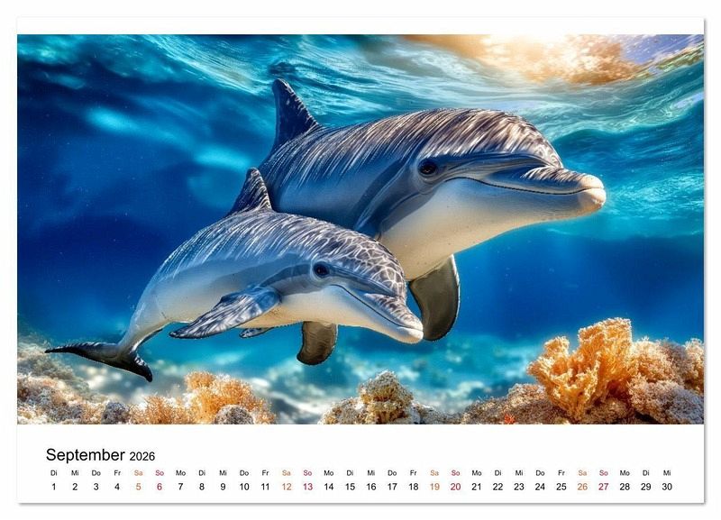 Entdecken Sie eine Welt voller Anmut, Freiheit und Lebensfreude mit atemberaubenden KI-generierten Bildern. Ob elegant aus den Wellen springend, pfeilschnell durchs Wasser gleitend oder sanft in der Tiefe schwebend - Delfine verzaubern mit ihrer Energie, ihrer Verspieltheit und ihrem natürlichen Charme. Mal allein, mal in vertrauter Zweisamkeit oder lebendig in Gruppen - dieser Kalender fängt die ganze Vielfalt ihres Lebensraums und ihres Wesens ein und erinnert daran, wie wertvoll und schützenswert unsere Ozeane sind. Ein perfektes Geschenk für alle, die das Meer lieben - und Delfine noch mehr.