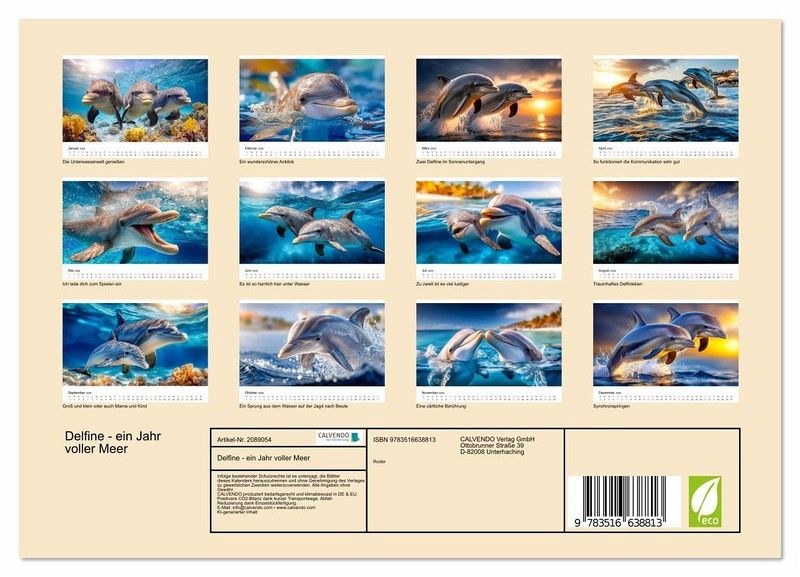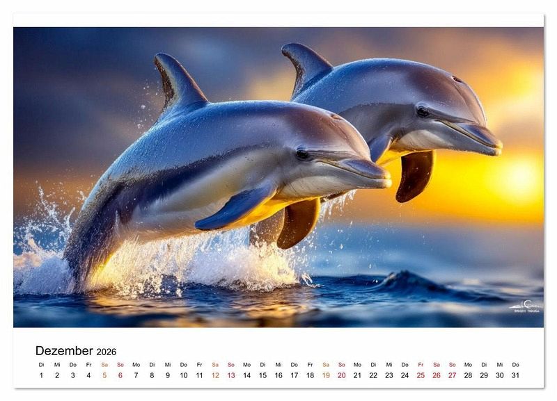 Entdecken Sie eine Welt voller Anmut, Freiheit und Lebensfreude mit atemberaubenden KI-generierten Bildern. Ob elegant aus den Wellen springend, pfeilschnell durchs Wasser gleitend oder sanft in der Tiefe schwebend - Delfine verzaubern mit ihrer Energie, ihrer Verspieltheit und ihrem natürlichen Charme. Mal allein, mal in vertrauter Zweisamkeit oder lebendig in Gruppen - dieser Kalender fängt die ganze Vielfalt ihres Lebensraums und ihres Wesens ein und erinnert daran, wie wertvoll und schützenswert unsere Ozeane sind. Ein perfektes Geschenk für alle, die das Meer lieben - und Delfine noch…mehr