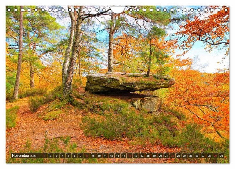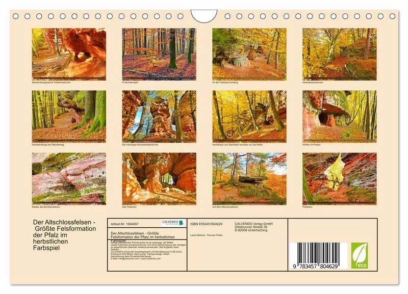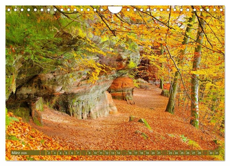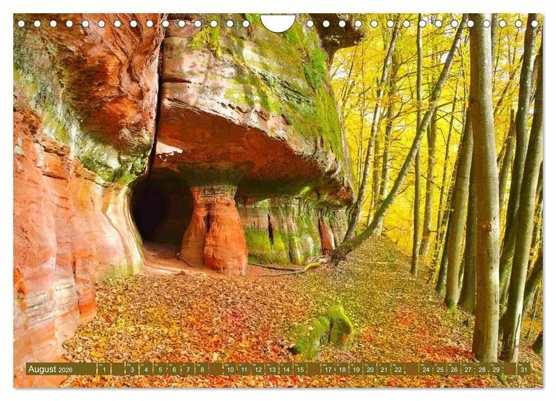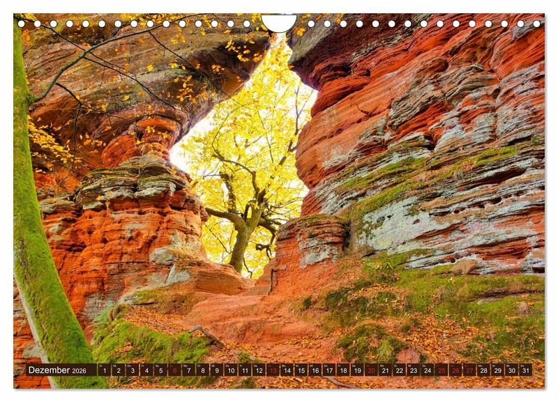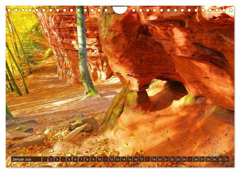 Der Altschlossfelsen ist eine 1,5 km lange Felswand bei Eppenbrunn im Pfälzerwald. Der Altschlosspfad erschließt mit immer neuen Ansichten den malerischen Felsen. Mächtige Buntsandsteintürme, Höhlen und ein riesiges Felsentor versprechen eine abwechslungsreiche Wanderung. Auch das Gipfelplateau kann auf schmalen Pfaden erkundet werden. Entdecken Sie mit diesem Kalender diese Naturschönheit an einem sonnigen Herbsttag.
