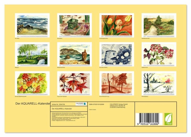 QUALITÄT - Hochwertiger Fotokalender mit 12 wunderschönen Motiven auf lichtbeständigem Bilderdruckpapier, robuste Spiralbindung mit Aufhängebügel.NACHHALTIG - deutliche Abfallreduzierung durch bedarfsgerechte Einzelstückfertigung, umweltfreundliches FSC-zertifiziertes Papier, Produktion in Deutschland, klimabewusste Logistik.PERFEKTES GESCHENK - Kalender für Freunde und Familie, für Kinder und Erwachsene, jung und alt, zu Weihnachten, Geburtstag oder zwischendurch.VIELFALT - Bildkalender in verschiedenen Formaten, z.B. DIN A5, DIN A4, DIN A3 sowie DIN A2. Ob Naturmotiv, Gemälde oder Fotos, ideal für ein persönliches Wohlfühlambiente.Mit ausgewählten Aquarellen durch die Zeiten des Jahres von Autor(in): Catill