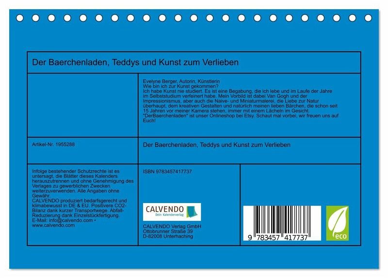 QUALITÄT - Hochwertiger Fotokalender mit 12 wunderschönen Motiven auf lichtbeständigem Bilderdruckpapier, robuste Spiralbindung.NACHHALTIG - deutliche Abfallreduzierung durch bedarfsgerechte Einzelstückfertigung, umweltfreundliches FSC-zertifiziertes Papier, Produktion in Deutschland, klimabewusste Logistik.PERFEKTES GESCHENK - Kalender für Freunde und Familie, für Kinder und Erwachsene, jung und alt, zu Weihnachten, Geburtstag oder zwischendurch.VIELFALT - Bildkalender in verschiedenen Formaten, z.B. DIN A5, DIN A4, DIN A3 sowie DIN A2. Ob Naturmotiv, Gemälde oder Fotos, ideal für ein persönliches Wohlfühlambiente.Teddys und Kunst zum Verlieben in zauberhaften Bildern von Autor(in): Evelyne Berger