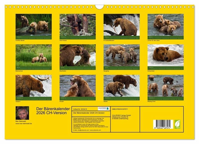 QUALITÄT - Hochwertiger Fotokalender mit 12 wunderschönen Motiven auf lichtbeständigem Bilderdruckpapier, robuste Spiralbindung mit Aufhängebügel.NACHHALTIG - deutliche Abfallreduzierung durch bedarfsgerechte Einzelstückfertigung, umweltfreundliches FSC-zertifiziertes Papier, Produktion in Deutschland, klimabewusste Logistik.PERFEKTES GESCHENK - Kalender für Freunde und Familie, für Kinder und Erwachsene, jung und alt, zu Weihnachten, Geburtstag oder zwischendurch.VIELFALT - Bildkalender in verschiedenen Formaten, z.B. DIN A5, DIN A4, DIN A3 sowie DIN A2. Ob Naturmotiv, Gemälde oder Fotos, ideal für ein persönliches Wohlfühlambiente.Grizzlybären - ein Fotoshooting der besonderen Art von Autor(in): Max Steinwald