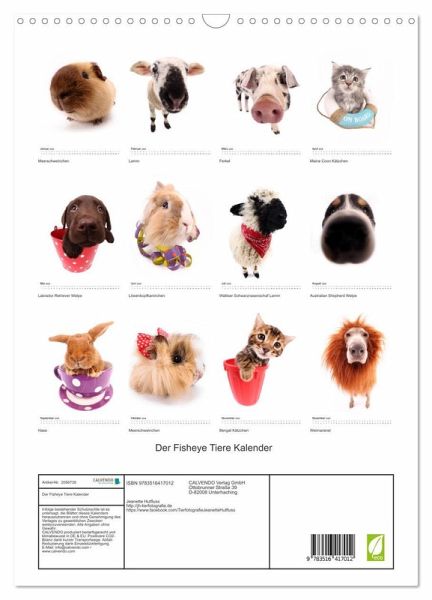 QUALITÄT - Hochwertiger Fotokalender mit 12 wunderschönen Motiven auf lichtbeständigem Bilderdruckpapier, robuste Spiralbindung mit Aufhängebügel.NACHHALTIG - deutliche Abfallreduzierung durch bedarfsgerechte Einzelstückfertigung, umweltfreundliches FSC-zertifiziertes Papier, Produktion in Deutschland, klimabewusste Logistik.PERFEKTES GESCHENK - Kalender für Freunde und Familie, für Kinder und Erwachsene, jung und alt, zu Weihnachten, Geburtstag oder zwischendurch.VIELFALT - Bildkalender in verschiedenen Formaten, z.B. DIN A5, DIN A4, DIN A3 sowie DIN A2. Ob Naturmotiv, Gemälde oder Fotos, ideal für ein persönliches Wohlfühlambiente.Tiere mit dem Fisheye Objektiv lustig in Szene gesetzt von Autor(in): Jeanette Hutfluss