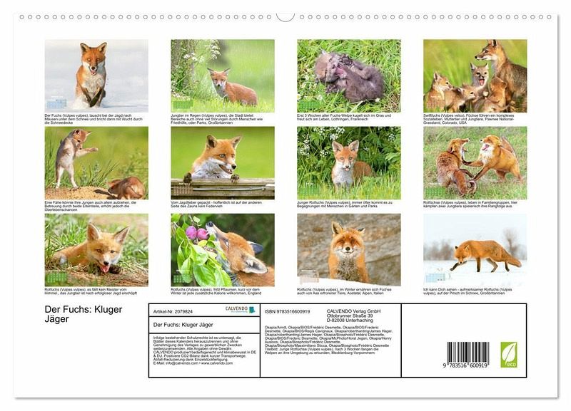 Mit diesem Kalender und beeindruckenden Naturfotografien erhalten Sie wunderbare Einblicke in das heimliche Leben der Füchse. Begleiten Sie den klugen Jäger bei der Pirsch im Schnee, beim rangeln mit Artgenossen und bei der Aufzucht seiner Jungen. Folgen Sie Ihm durch die Jahreszeiten und erfreuen Sie sich an den 12 Monatsseiten mit Fotos in diesem Kalender.