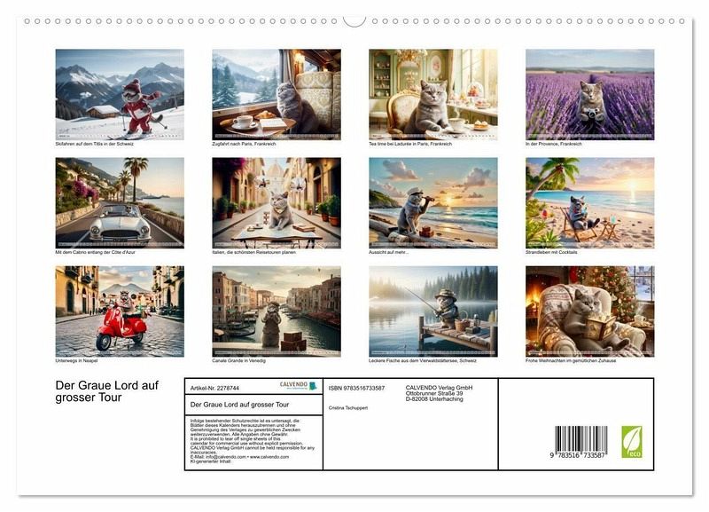Ein KI-Kalender mit Liebe zum Detail! Der Kalender zeigt Bilder von einem Kartäuser, der von der Schweiz nach Frankreich und Italien reist. Eine Inspirationsquelle für die nächste Reise soll er sein und ein täglicher Beweis, dass Katzen die Welt erobern können. Das perfekte Geschenk für Reiseliebhaber und Katzenfreunde!