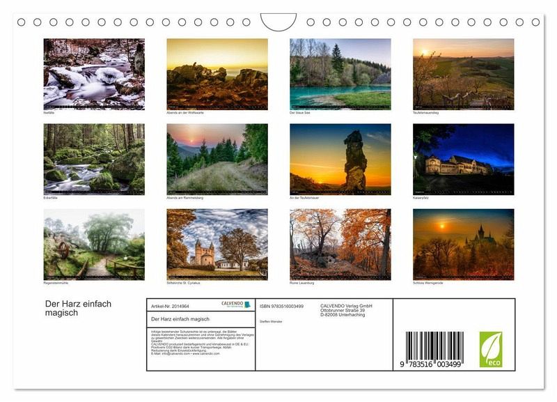 QUALITÄT - Hochwertiger Fotokalender mit 12 wunderschönen Motiven auf lichtbeständigem Bilderdruckpapier, robuste Spiralbindung mit Aufhängebügel.NACHHALTIG - deutliche Abfallreduzierung durch bedarfsgerechte Einzelstückfertigung, umweltfreundliches FSC-zertifiziertes Papier, Produktion in Deutschland, klimabewusste Logistik.PERFEKTES GESCHENK - Kalender für Freunde und Familie, für Kinder und Erwachsene, jung und alt, zu Weihnachten, Geburtstag oder zwischendurch.VIELFALT - Bildkalender in verschiedenen Formaten, z.B. DIN A5, DIN A4, DIN A3 sowie DIN A2. Ob Naturmotiv, Gemälde oder Fotos, ideal für ein persönliches Wohlfühlambiente.Der Harz in magischen Bildern von Autor(in): Steffen Wenske