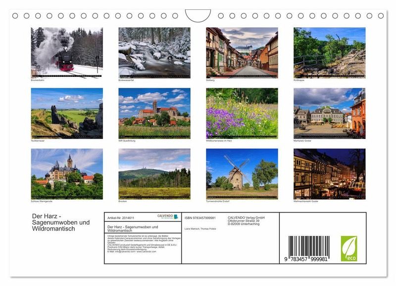 Der Harz ist ein Wanderparadies im Herzen Deutschlands. Dazu finden sich malerische Fachwerkstädte, großartige Kirchen, Klöster und Burgen. Dieser Kalender zeigt einen Querschnitt durch diese abwechslungsreiche Urlaubsregion und zeigt u.a. den Brocken, die Teufelsmauer, Quedlinburg und die alte Kaiserstadt Goslar.