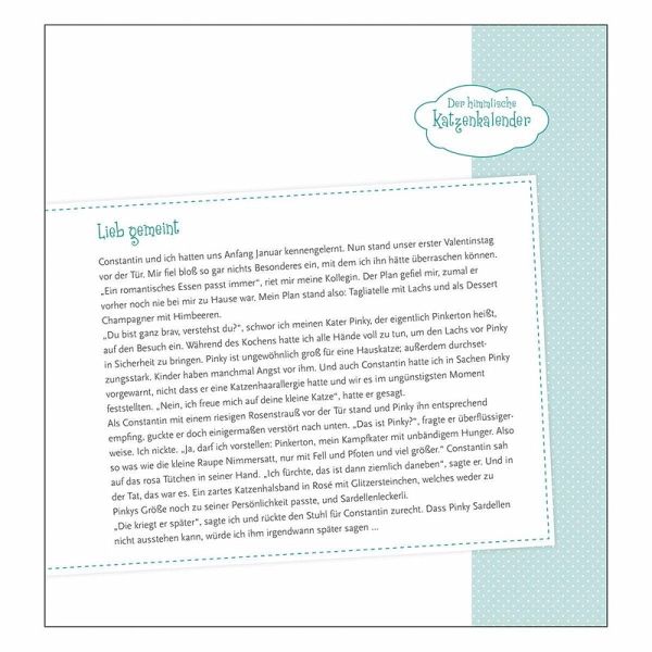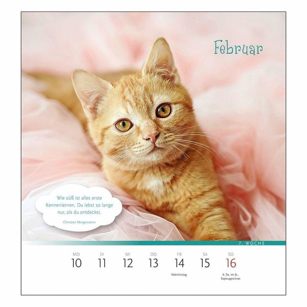 Dieser liebevoll gestaltete Wochenkalender wird das Herz jedes Katzenfreundes erwärmen: Auf jedem Kalenderblatt finden sich ein wunderschönes Katzenfoto und eine kurze Geschichte oder Anekdote aus dem Leben der Samtpfoten und ihrer Zweibeiner. Mal humorvoll, mal zum Nachdenken anregend zeigen diese Geschichten: Auch die kleinsten Geschöpfe Gottes verdienen Achtung und können des Menschen Herz erobern. - niedliche Katzenfotos: verspielt, elegant, heiter, originell- 53 unterhaltsame Geschichten über Samtpfoten- praktisches Wochenkalendarium- Wand- und Aufstellkalender