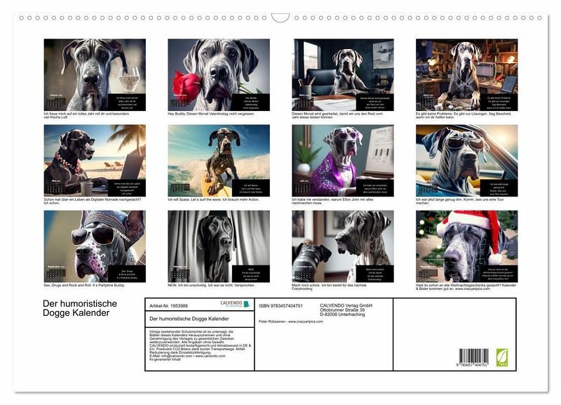 Entdecken Sie den ultimativen Jahreskalender für alle Doggen-Liebhaber! Unser einzigartiger Kalender präsentiert eine Sammlung von humorvollen und herzerwärmenden Doggen-Motiven, die durch KI generiert wurden. Jedes Bild wird von einem passenden Spruch begleitet, der das Wesen und die Persönlichkeit dieser liebenswerten Riesen perfekt einfängt.