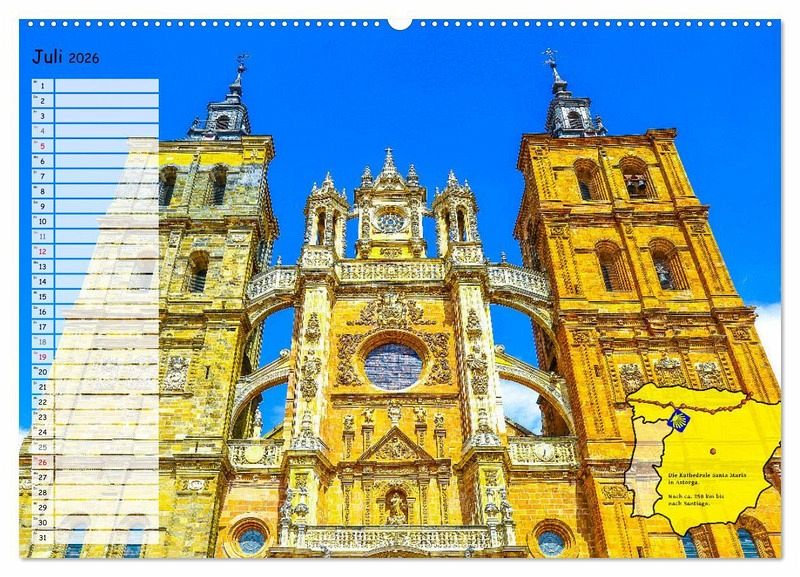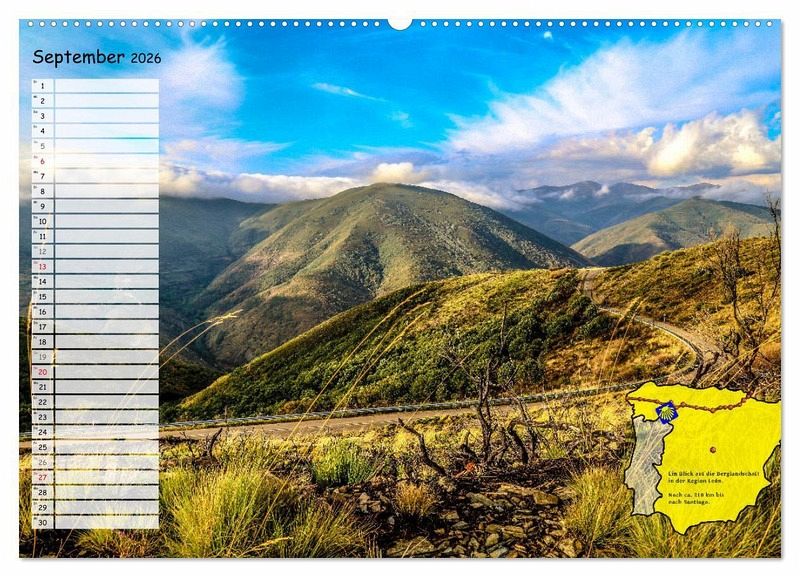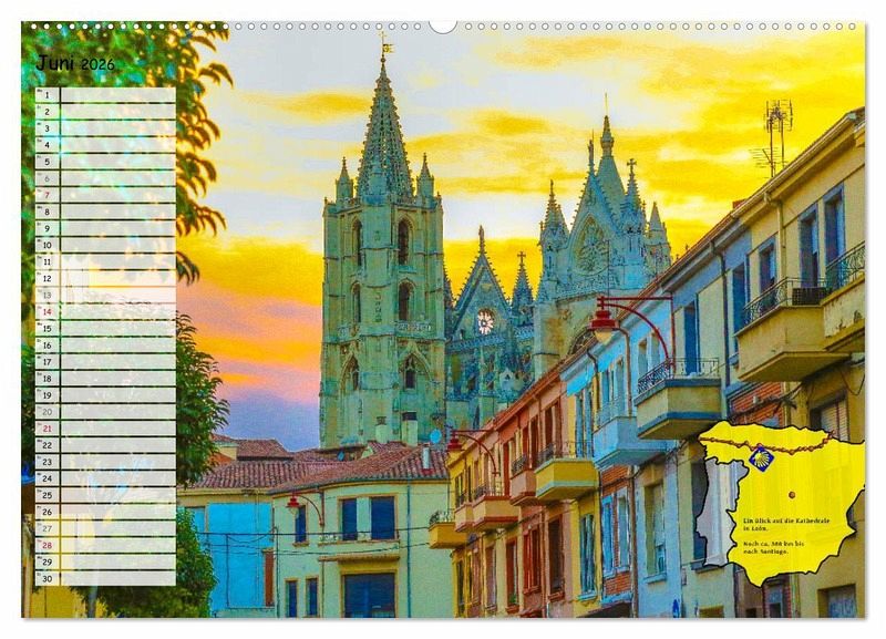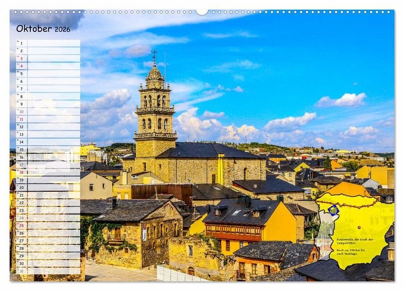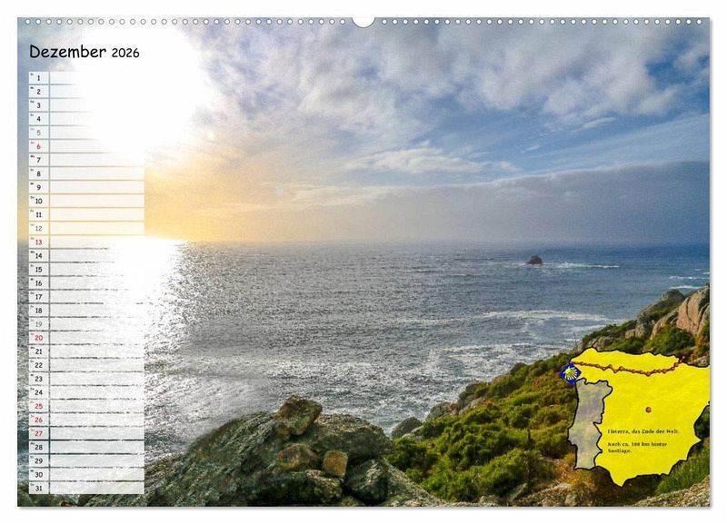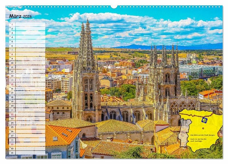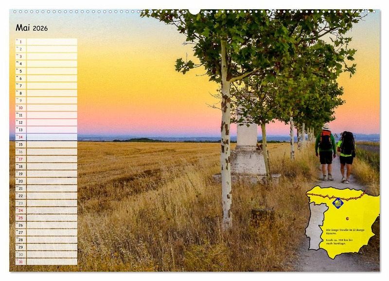 Dieser Kalender veranschaulicht einige der Höhepunkte des rund 800 km langen Pilgerweges. Von Saint Jean Pied de Port nach Santiago de Compostela, lassen Sie sich von den farbenfrohen Landschaften und Strukturen motivieren!