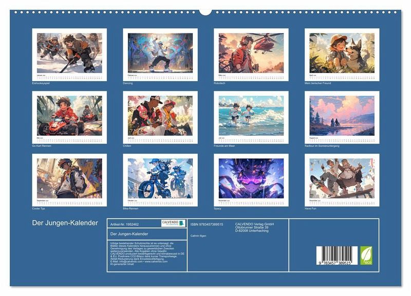 Dieser zauberhafte Kalender ist speziell für Jungen konzipiert und enthält Motive mit coolen Jungs bei Sport und Spiel im beliebten Anime-Stil. Jeder Monat ist einzigartig und zeigt eine andere Kombination der Kids und Teens in verschiedenen Szenarien, ob beim Skaten, Biken oder als toller Tänzer. Die Zeichnungen wurden von einer KI erstellt und sind lebendig und farbenfroh, was den Kalender zu einem perfekten Geschenk für kleine und große Anime-Liebhaber macht.