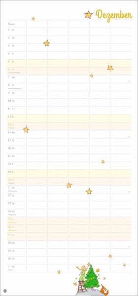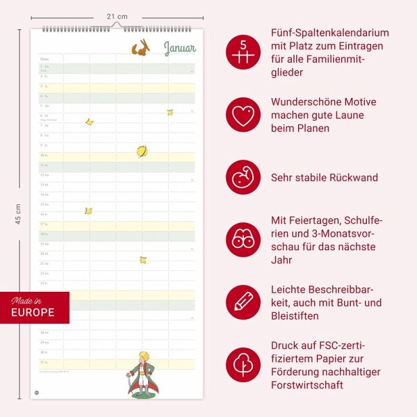 - Bestens organisiert mit dem Kleinen Prinzen: Antoine de Saint-Exupérys Kinderbuch-Held im großen Familienkalender 2026- Monat für Monat die beliebtesten Motive aus dem modernen Märchen entdecken: Der Kleine Prinz, seine Rose und der Wert von Liebe und Freundschaft- Unser erfolgreiches Konzept für Familienplaner: 5 Spalten Platz, um Licht im Termin-Dschungel zu schaffen, inklusive Schulferienübersicht und 3-Monats-Vorschau auf das Folgejahr- Praktische Passform für die Küchenwand oder den Hausflur: Terminkalender im Hochformat 21x45 cm für den schnellen Überblick- Gemeinsam Pläne schmieden: Die Familien-Wandkalender von Heye aus dem Athesia Kalenderverlag