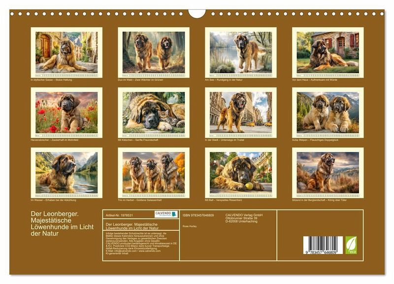 Dieser Kalender widmet sich der majestätischen Erscheinung und dem sanftmütigen Wesen des Leonbergers. Jede Szene erzählt eine stille Geschichte von Treue, Gelassenheit und Stärke. Alle Bilder wurden mit der Hife von KI erstellt und zeigen diese schönen Hunde inmitten idyllischer Landschaften, mal wachsam, mal verspielt, mal in stolzer Ruhe. Ein Herzensprojekt für alle Hundefreunde, die die sanfte Kraft dieser besonderen Rasse lieben.