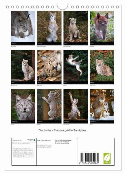 QUALITÄT - Hochwertiger Fotokalender mit 12 wunderschönen Motiven auf lichtbeständigem Bilderdruckpapier, robuste Spiralbindung mit Aufhängebügel.NACHHALTIG - deutliche Abfallreduzierung durch bedarfsgerechte Einzelstückfertigung, umweltfreundliches FSC-zertifiziertes Papier, Produktion in Deutschland, klimabewusste Logistik.PERFEKTES GESCHENK - Kalender für Freunde und Familie, für Kinder und Erwachsene, jung und alt, zu Weihnachten, Geburtstag oder zwischendurch.VIELFALT - Bildkalender in verschiedenen Formaten, z.B. DIN A5, DIN A4, DIN A3 sowie DIN A2. Ob Naturmotiv, Gemälde oder Fotos, ideal für ein persönliches Wohlfühlambiente.Fotografien vom eurasischen Luchs von Autor(in): Cloudtail the Snow Leopard